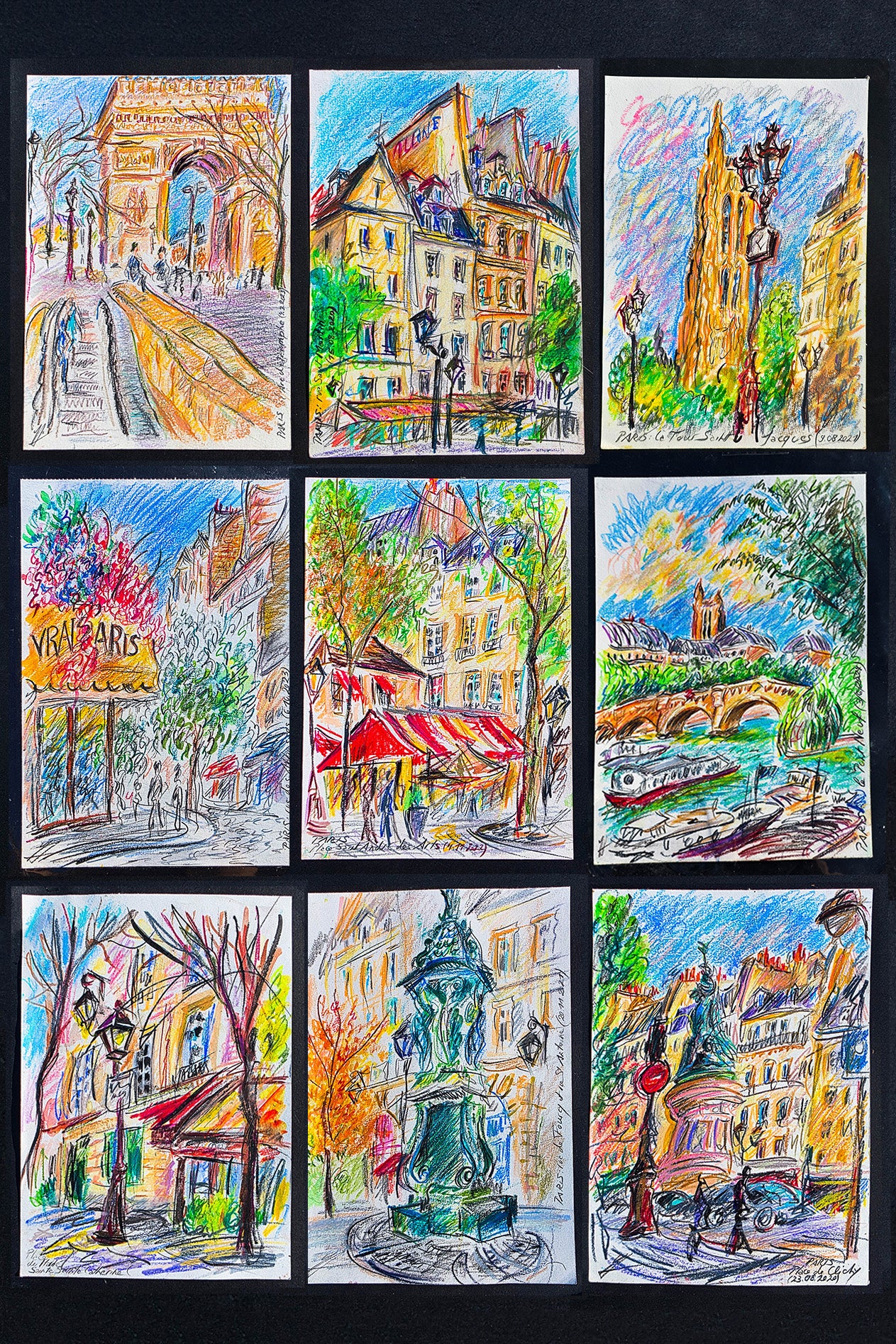 Yann Le Houelleur, fait de la rue son atelier, il y déploie ses crayons, souvent à même le sol de sorte à retranscrire en traits et en couleurs ce que la capitale lui offre à voir. Ces œuvres sont le fruit d’un regard sensible et d’une démarche intime, mêlant art, errance et observation.