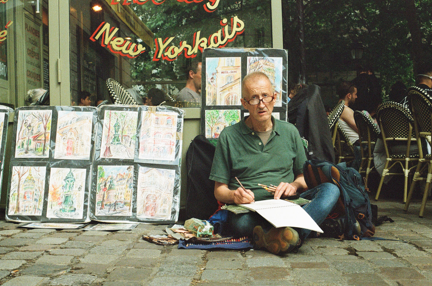 Yann Le Houelleur transforme chaque trottoir en atelier à ciel ouvert. Installé là où la ville bruisse, il capte d’un trait vif l’âme des passants, l’architecture mouvante, la lumière changeante.
